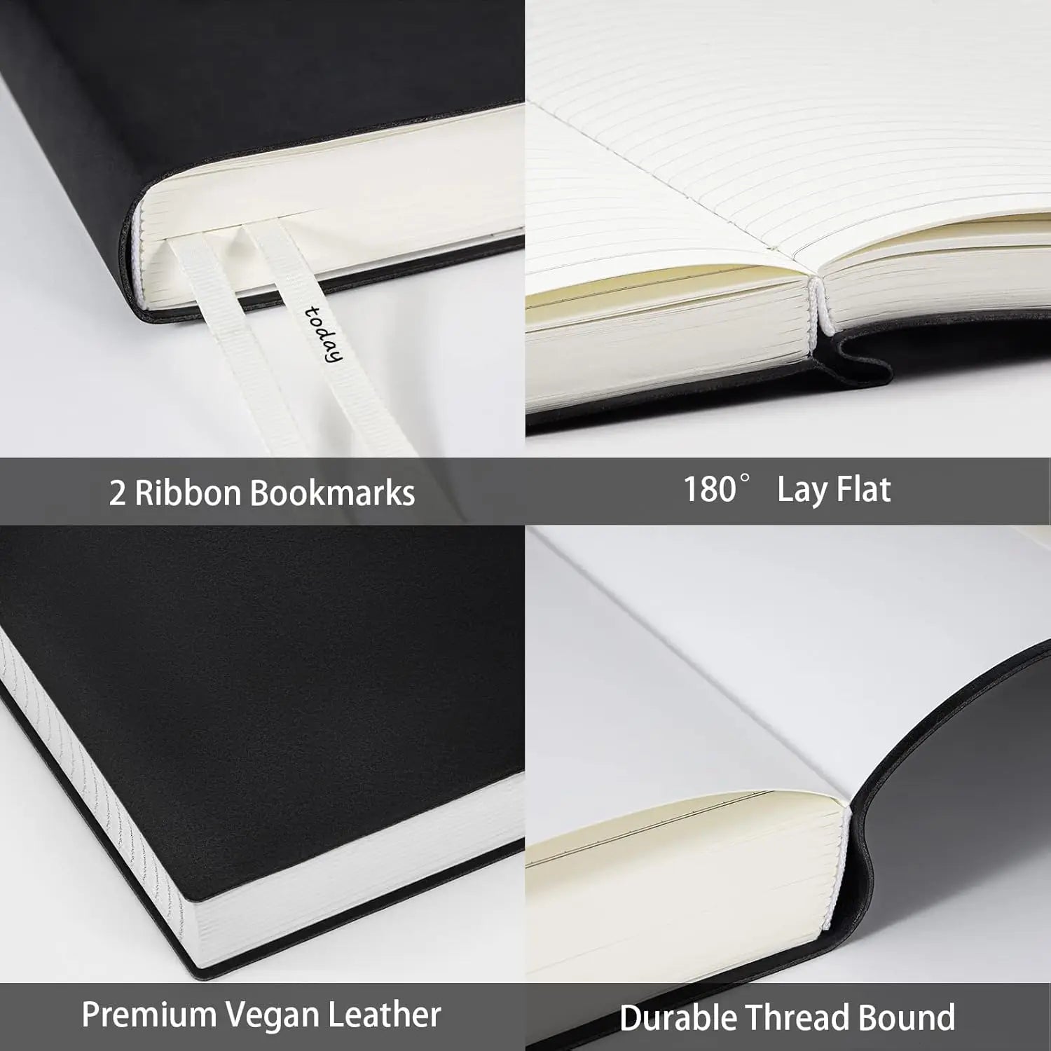 Discover our premium leather journal notebook, designed to enhance your writing and organization experience. This versatile notebook is perfect for various uses, from professional work to academic studies. Key Features: - **Durable Leather Cover**: Made from high-quality leather that offers a classic look and long-lasting protection for your notes. The black finish adds a sleek, professional touch suitable for any setting. - **Large A4 Size (8.5 x 11 inches)**: Provides ample space for writing, sketching, or planning. Its standard size makes it easy to carry in bags or use on desks without taking up too much room. - **400 Pages of College-Ruled Paper**: Each page features college-ruled lines to help keep your writing neat and organized. The thick paper minimizes bleed-through from pens or markers, ensuring clean pages throughout. - **Includes 125 Sticky Tabs**: Comes with a set of 125 sticky tabs in various colors, allowing you to easily categorize sections, mark important pages, or create custom indexes for quick reference. - **Convenient Inner Pocket**: An inner pocket is located at the back of the journal, perfect for storing loose papers, receipts, photos, or other small items securely without them getting lost. - **Versatile Use Cases**: Ideal for students taking notes in class, professionals organizing meetings and projects at work, writers journaling ideas, or anyone needing a reliable notebook for daily tasks. It serves as an excellent gift option due to its practical design and aesthetic appeal. - **High-Quality Construction**: Bound with sturdy stitching to ensure durability even with frequent use. The pages lay flat when open for comfortable writing on both sides without straining the spine. This leather journal combines functionality with style, making it a must-have accessory for anyone who values organization and creativity in their daily life. Whether you're jotting down thoughts at home or managing tasks in the office school environment.